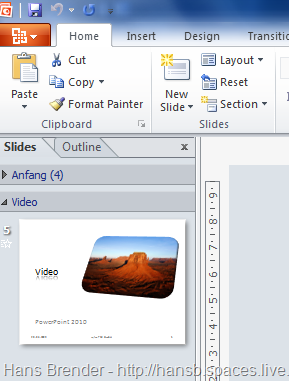 Microsoft PowerPoint 2010 vereinfacht das Arbeiten. So kann, ähnlich wie in Word mit Gliederungen, hier Sektionen genannt, gearbeitet werden. An jeder Stelle, besser, vor einer Folie kann eine Sektion hinzugefügt werden. Diese Sektion kann auch vom Benutzer mit einem Namen versehen werden. Die Funktionen “Sektion” finden wir in der Multifunktionsleiste “Home”