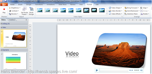 PowerPoint und Video ? Ja, endlich ist es möglich ein vorhandenes Video nicht nur einzubinden, sondern die Größe festzulegen, mit den Video Tools die Darstellung, ähnlich wie bei Bildern, anzupassen. Das Video kann mit neuer Farbe versehen, die Helligkeit angepasst oder der Kontrast verändert werden.