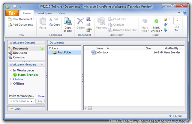 Um diesen Workspace mit anderen zu teilen, müssen diese Benutzer SharePoint Workspace 2010 benutzen. Groove 2007 Benutzer haben keinen Zugriff und werden aufgefordert, auf SharePoint Workspace 2010 um zu steigen.Der wesentliche Unterschied ist jedoch, ich kann mit Windows 7 nach den Inhalten suchen.