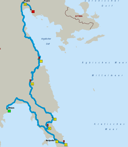 Besonders angetan hat uns eine französische Wohnmobilfahrerin, die wir in den Bergen überholt hatten, die aber auch „heil“ angekommen ist. Hut ab, selbst mir war es etwas schummrig. Und wir saßen im SLK. Ab jetzt geht’s dann immer der Küste lang nach Norden. Über Monemvassia, Leonidio nach Nafplio zu einem Stechmücken Campingplatz mit handgemalten Schildern. Klein, fein, mit WLAN und dem Oranje-Sieg.