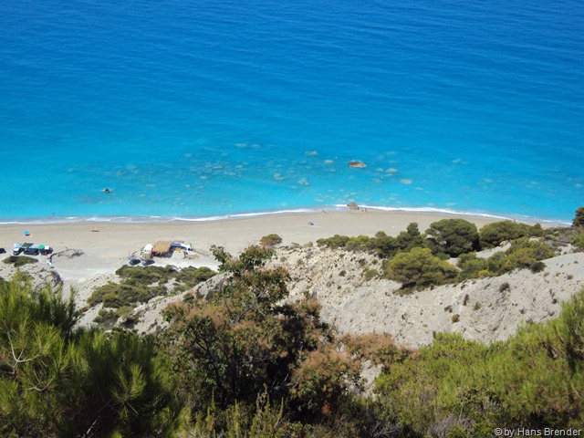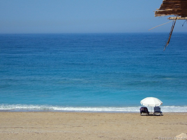 10.7.2010Nach der gestrigen „Mammut“-Tour haben wir heute schlappe 180 km zurückgelegt. Waren auch bei einer Umsonst Bucht, hatten wir als Tipp bekommen, aber die war total überlaufen. Und wir waren enttäuscht, hatten wir doch noch auf der Rundfahrt der Halbinsel Levkada einen TUI-Strand erfahren, ziemlich steil die Küste hinunter und dann das Wahnsinns-Bild. Ein langer Strand mit Wellen, 2 Kiosken und weiße Sonnenschirme, gepaart zu blauen Liegenstühlen und ein sagenhaftes blaues Meer, in allen Schattierungen. Und „fast“ leer.