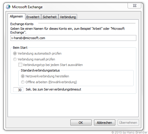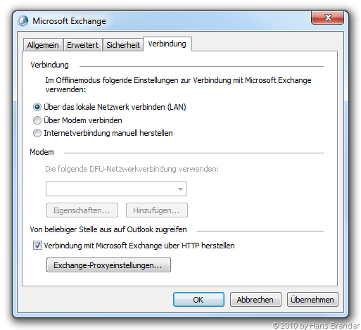 | Microsoft Exchange: Wechseln Sie auf den Kartenreiter Verbindung |