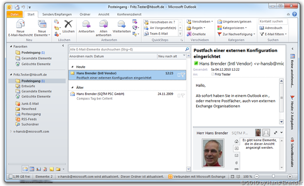 1. Anschließend haben Sie in einem Outlook-Profil mehrere Postfächer, in diesem Beispiel jetzt 2, zu unterschiedlichen Exchange-Organisationen. Outlook 2010 ist in der Lage, unterschiedliche Signaturen, Kalender, Abwesenheitsnachrichten (OOF =Out of Office) Mitteilungen zu verwalten. Mails können einfach von einem Postfach in das andere verschoben werden, Termine per Drag & Drop von einer Organisation in die andere kopiert werden.