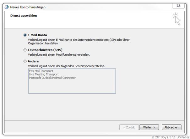| Neues Konto: Wahlen Sie E-Mail-Konto aus und klicken Sie auf Weiter |