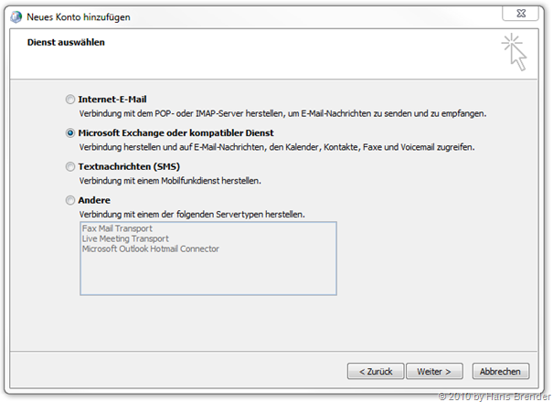 | Dienst auswählen: Wählen Sie Microsoft Exchange oder kompatibler Dienst und klicken Sie auf Weiter |