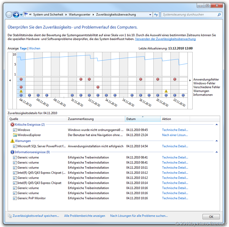 Auf einer Skala von 1 bis 10 wird eine Bewertung des Systems über den gesamten Verlauf des Betriebssystems angezeigt. Mit einem Klick auf einen bestimmten Tag werden dann alle Änderungen, Treiberinstallationen und Updates, erfolgreich oder nicht erfolgreich, angezeigt.