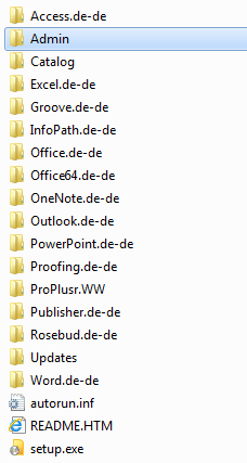 Also habe ich den Netzwerkpfad der von MSDN heruntergeladenen Office Version untersucht. Und hier fehlt der komplette Admin Pfad. Diverse Hinweise im Web verweisen alle darauf, dass dies nur mit Office Versionen möglich ist, die als Volumen Lizenz erworben wurden. Office 2010 Professional Plus gibt es jedoch nur als Volumenlizenz.