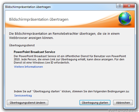 Microsoft PowerPoint 2010 enthält ein tolles Feature: die Broadcast Slideshow. Hier kann ich über das Internet meine fertige PowerPoint Präsentation anderen Teilnehmern zeigen, ohne dass diejenigen PowerPoint auf Ihrem Rechner installiert haben müssen. Ein Internet-Zugang genügt. Wie funktioniert das ?