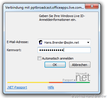 | Der Präsentator muss eine Live ID haben und seine Anmeldeinformationen eintragen. Haben Sie noch keine Live-ID können Sie sich hier eine kostenlos erstellen. | |