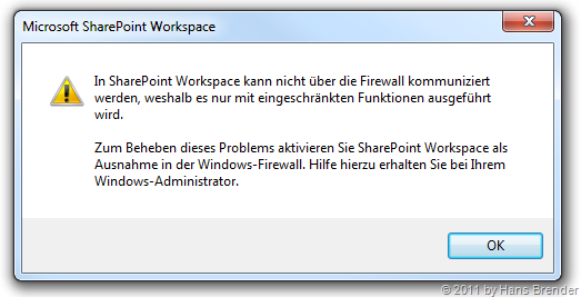 Beim Starten von SharePoint Workspace 2010 wird diese Warnung ausgegeben, weil die lokale Firewall SharePoint Workspace 2010 geblockt hat.