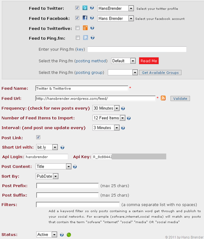 Registrieren sie sich mit Username und Passwort. Danach werden Ihr Twitter und Facebook Account hinterlegt. Das sind auch genau die 3 Dienste, die Twitterlive versorgt. Dafür aber können Sie mehrere Twitter, Facebook und Ping.fm Accounts mit mehreren rSS.Feeds verknüpfen.