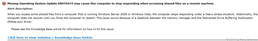 Der Link führt mich dann direkt zur Microsoft Support-Seite, in meinem Fall eine Hotfix-Seite. Nachdem man dann ´den Fehler behoben hat, in meinem Fall den Hotfix installiert, wird nach der nächsten Meldung über den Gateway-Server an den Microsoft System Center Advisor die Fehlermeldung nicht mehr angezeigt.
