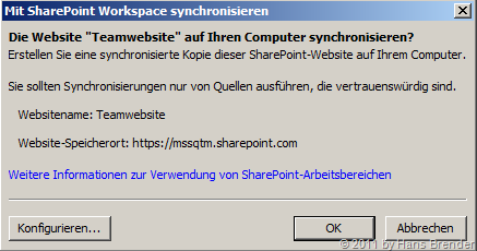 Im nachfolgenden Dialog besteht noch die Möglichkeit, den “Download” einzuschränken, dazu klicken Sie auf Konfigurieren Dialog: Mit SharePoint Workspace synchronisieren
