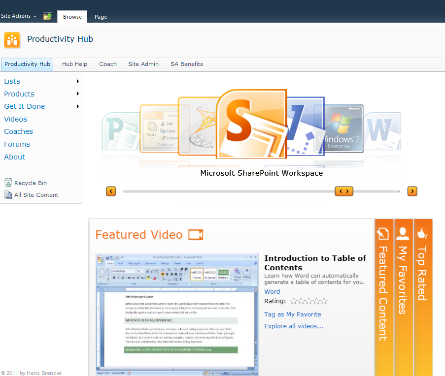 eine vorinstallierte SharePoint Websitesammlung, optimiert für Web 2.0 Funktionalität für SharePoint Server 2010, Es zeigt den Endbenutzern an vielen Beispielen die Möglichkeit, wie mit den vielen Office Produkten die Produktivität gesteigert werden kann. Dabei werden verschieden Formate wie Dokumente, Videos, Podcasts, etc.) für eine Aus- bzw. Weiterbildung zur Verfügung gestellt.