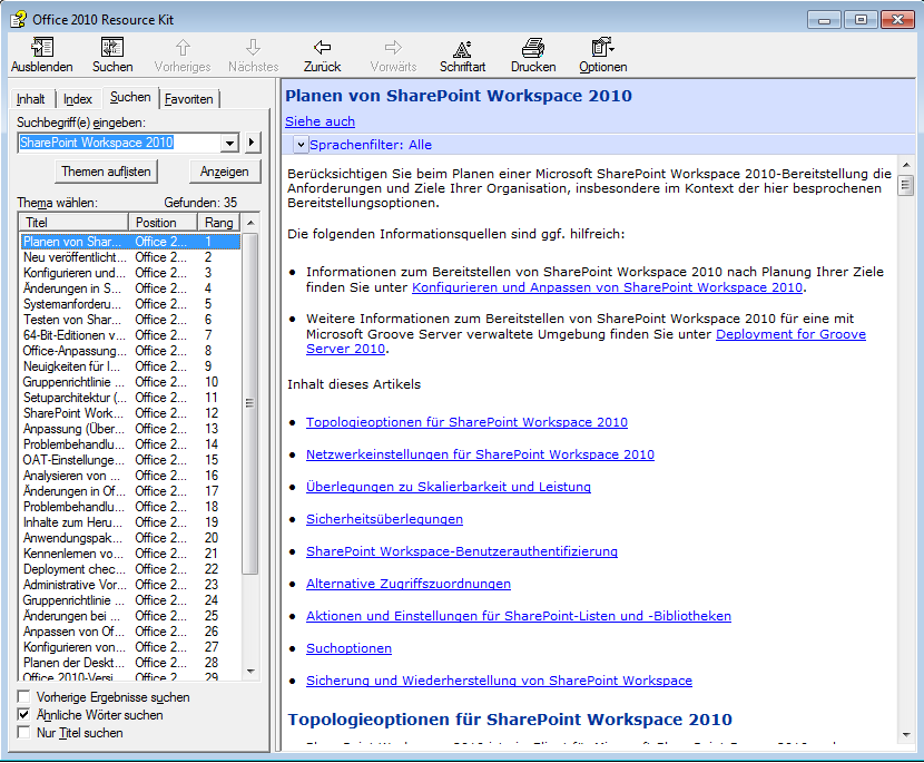 In der 2.7 MB großen Datei im chm Format werden alle Informationen auch zu Microsoft SharePoint Workspace 2010 zur Anpassung lokal aufrufbar in einer Hilfe-Datei zusammengefasst.