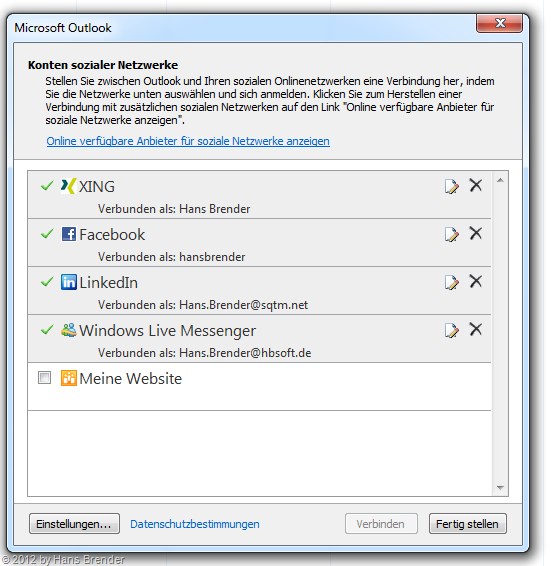 | Hier können derzeit die Netzwerke von XING, Facebook, LinkedIn, Windows Live Messenger (in Kürze heißt dieser Service Messaging app siehe auch Blogbeitrag hier)