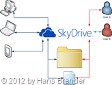 Dabei enthalten ist auch Cloud-Speicher (7GB) unentgeltlich, und der Benutzer kann kostenpflichtig bis 100 GB den Cloud-Speicher zukaufen. In den verschiedenen Foren wird zur Zeit sehr heftig diskutiert, welche Unzulänglichkeiten SkyDrive derzeit im Vergleich zu den Mitbewerbern wie Dropbox oder Google Drive hat. Ein Vergleich finden Sie hier. Hier jetzt zur Beschreibung der obigen Abbildung. Ein Benutzer hat hier 3 Geräte, einen Desktop, einen Laptop und ein mobiles Device. Nach der Anmeldung werden dann Dateien (rote Pfeile), die in der Cloud gespeichert werden auch lokal synchronisiert. Und derzeit: Alles oder nichts. Mit der geleichen Anmeldung dann auch auf dem Laptop oder einem Smartphone. Ein tolles Feature ist der “Rückgriff” auf den heimischen Desktop (wenn eingeschaltet) So kann ich von unterwegs lesend auf Dateien des Desktops zugreifen (blaue Linie)