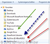 wenn wir die Abbildung mit der von SharePoint Workspace 2010 vergleichen, ist Sie fast identisch. Interessant ist, dass die SkyDrive Pro Datei immer noch den Namen Groove hat. Diese kommt mit bei der Installation vom nächsten Office. (Office Professional 2013). Leider kann auch SkyDrive Pro nicht mit unterschiedlichen SharePoint Servern. Frei nach: Es kann nur einen geben. Bedeutet: Auf alle innerhalb der Domäne befindlichen SharePoint Server klappt das ganze. Möchte ich mich zusätzlich mit einem SharePoint Server außerhalb meiner Domäne verbinden, funktioniert das ganze nicht. Deshalb auch die gestrichelte Linien in Grün und rot).