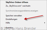 Aufrufen der Einstellungen bei SkyDrive rechter Mausklick auf das SkyDrive-Symbol in der Info-Leiste und auf Einstellungen klicken