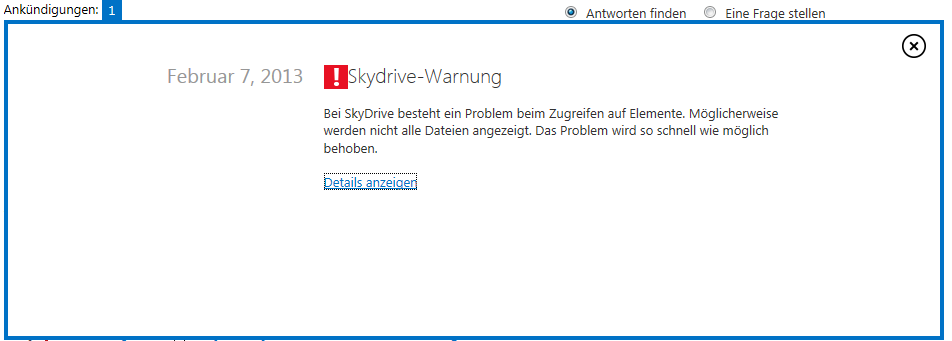Hier war es die Community-Seite Fragen und Antworten zu SkyDrive und dort poppte sogleich diese Nachricht hoch. Unter Details wird man dann zum Service-Status weitergeleitet.