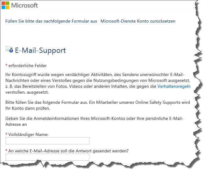 Der Benutzer muss trotzdem über eine Microsoft-Webseite ein Formular ausfüllen, um eine Entsperrung des Kontos zu bewirken
