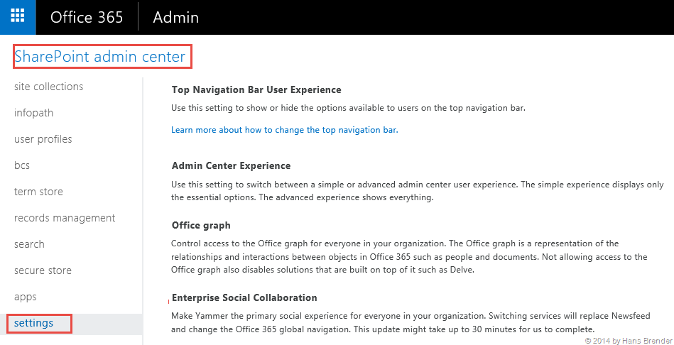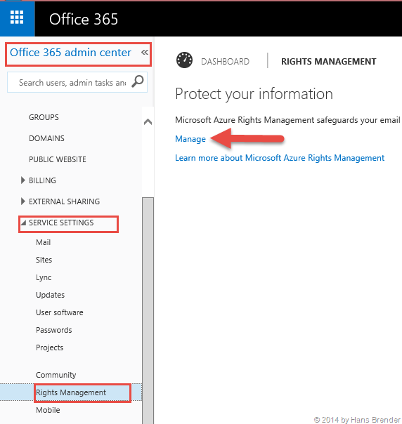 Wechseln Sie dazu als Administrator zur Verwaltungsseite von Office 365 – Diensteinstellungen und klicken Sie auf Verwalten |