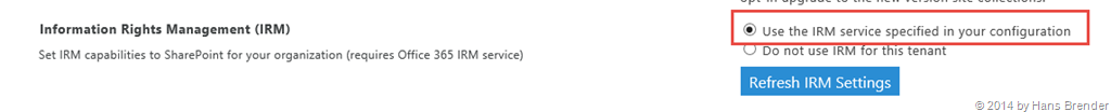Aktivieren Sie “Den in der Konfiguration angegebenen IRM-Dienst verwenden” und klicken dann auf IRM-Einstellungen aktualisieren, es sollte keine Fehlermeldung erscheinen. Zum Schluss am Ende der Seite auf “OK” Klicken