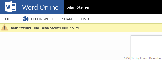 | Ein Word Dokument, welches mit IRM Schutz versehen wurde, wird beim Öffnen in Word Online mit einem Hinweis versehen | |