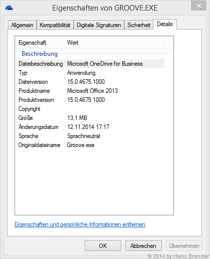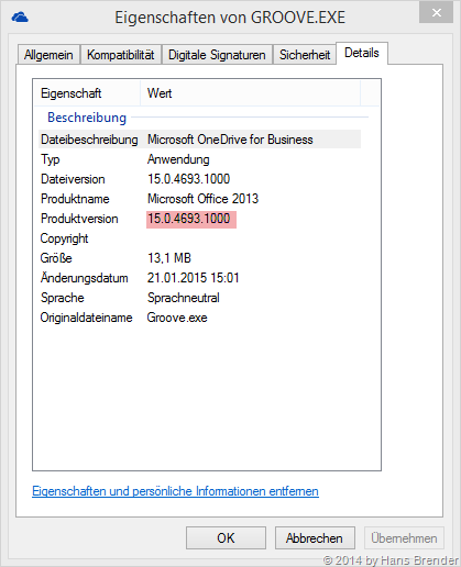 Im Februar Update gibt es jedoch wieder ein Patch für unsere Groove.exe, die derzeit noch die Grundlage für OneDrive for Business bildet. Dieser Patch mit der Nummer KB2920746 wurde von Microsoft am 10.2.2015 per die üblichen Update-Wege zur Verfügung gestellt. Er gilt für MSI-Installation, also für Office 2013, welches nicht per C2R installiert wurde (z.B. Microsoft Office 365 Home