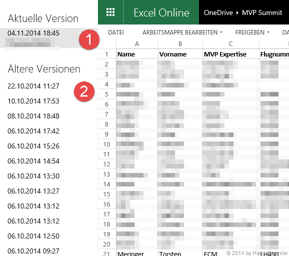 Als Beispiel sei hier eine Excel-Datei angeführt, die in seiner ursprünglichen Fassung in OneDrive gespeichert wurde. Danach habe ich einen Bearbeitungs-Link erstellt und diesen dann anderen zur Verfügung gestellt. Diese MVP Kollegen haben dann die Datei geöffnet (Office-Online) und eigene Daten eingetragen. Irgendwann hat jedoch jemand das Excel-Sheet falsch sortiert und nichts passte mehr zusammen. Soweit zum Szenario. Mit jedem Bearbeiten schreibt Excel (jedes Office Dokument) eine neue Version. Auch in OneDrive. Allerdings nur bis zu einer Tiefe von 25. Das habe ich hier schon einmal beschrieben.