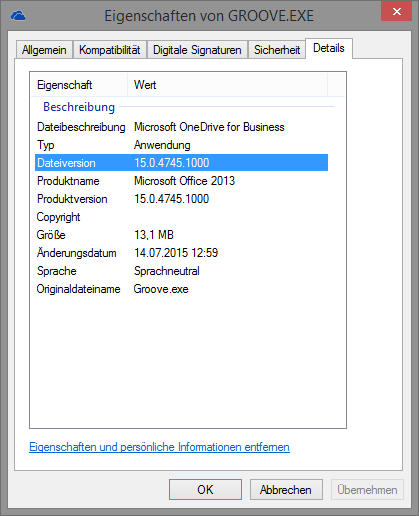Der Name des Synchronisations-Client für OneDrive for Business ist Groove.exe und befindet sich im Programm-Verzeichnis: X:\Program Files\Microsoft Office\Office15