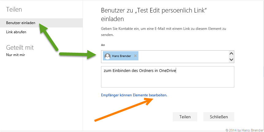 Es muss also der Benutzer (“Empfänger”) mit einer E-Mail eingeladen werden und die Datei / der Ordner muss zum “Bearbeiten” freigegeben werden.