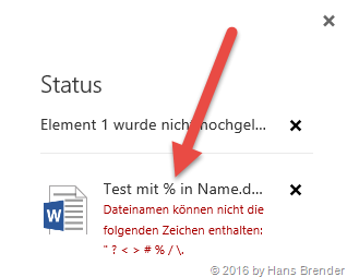 Beispiel: (unzulässiges Zeichen im Dateinamen) Klick auf das Wolkensymbol, dann weitere Informationen