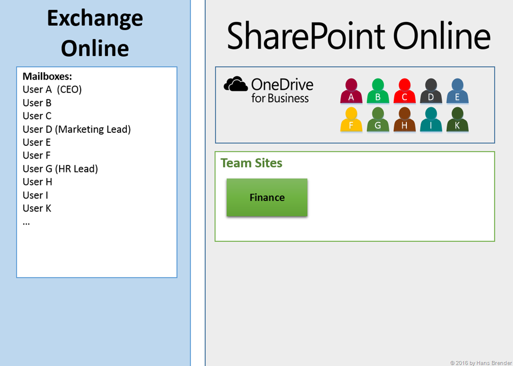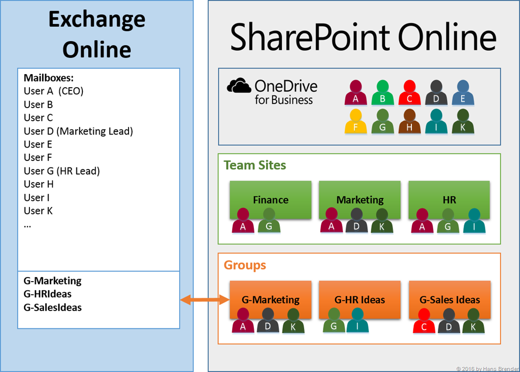 Die Mitarbeiter G und C aus den Bereichen Personal (HR) und Verkauf (Sales) verfahren in der gleichen Weise. Die Abbildung zeigt aber auch, dass für die jeweiligen angelegten Gruppen die E-Mail-Kommunikation und die Termine in Exchange Online gespeichert werden.