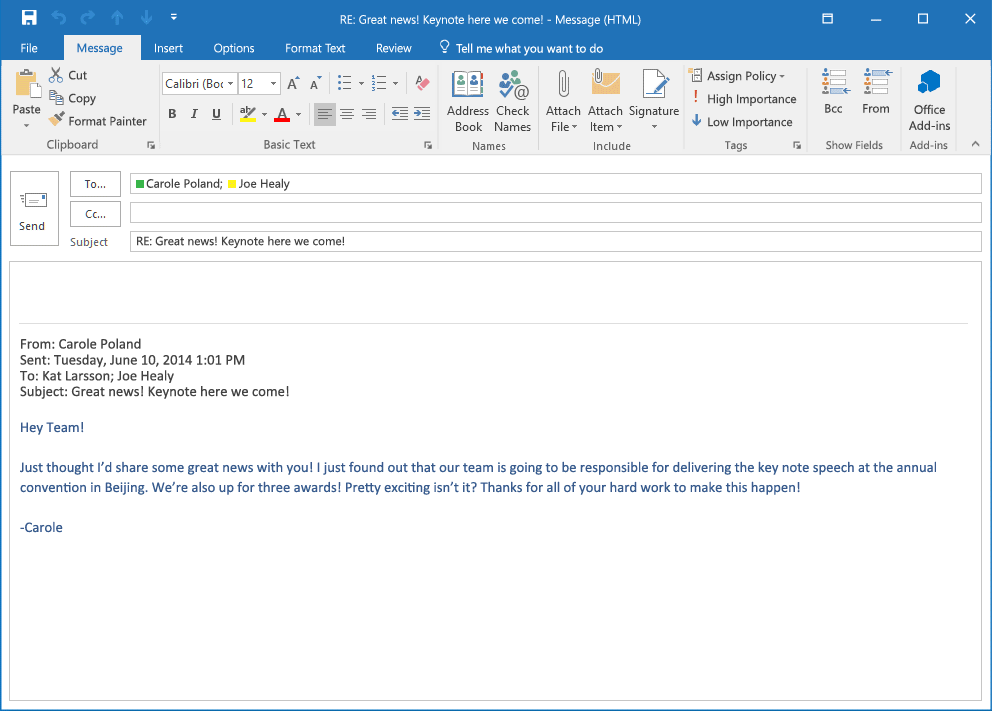Mit den Erwähnungen geht der Vertriebsleiter jetzt wesentlich effektiver um. AN und CC bleiben erst einmal außen vor. Betreff wird ausgefüllt und im Nachrichtenfeld schreibt er die Informationen für die einzelnen Mitarbeiter. An beliebiger Stelle kann er mit dem @Zeichen den Mitarbeiter auswählen, und dieser Mitarbeiter wird auch dann automatisch in die AN –Zeile übernommen.