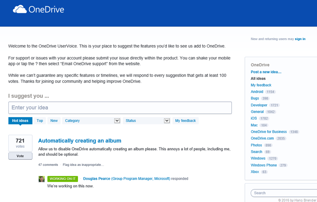 Über den UserVoice Kanal von OneDrive kann man (in englischer Sprache) Wünsche äußern. Diesen Kanal liest die Produktgruppe von Microsoft regelmäßig und gibt auch Rückmeldungen.