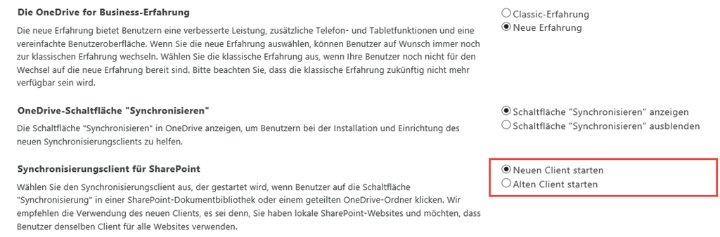 Wählen Sie für “Synchronisationsclient für SharePoint” die Option “Neuen Client starten” Und bestätigen sie das ganze mit OK