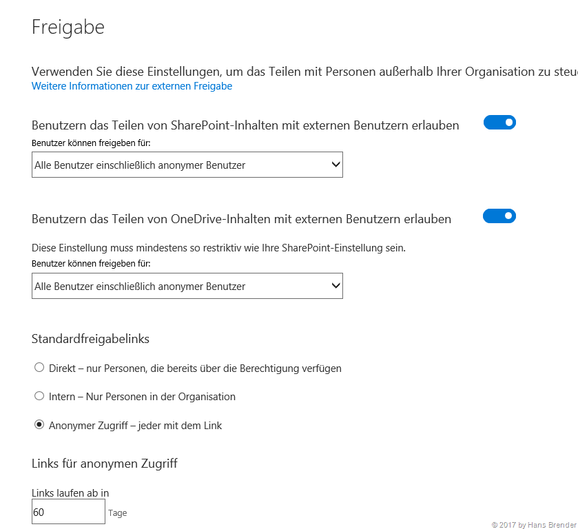 Der Administrator erlaubt den Benutzern die Freigabe für authentifizierter externe Benutzer und die Verwendung von anonymer Zugriffslinks, bei Verwendung von anonymen Zugriffslinks laufen diese nach 60 Tagen ab. Anonyme Zugriffslinks gestatten dem Empfänger bei Dateien das Anzeigen, bei Ordnern das Anzeigen, Bearbeiten und Hochladen. Die Voreinstellungen des Standardlinks ist ein anonymer Zugriff.