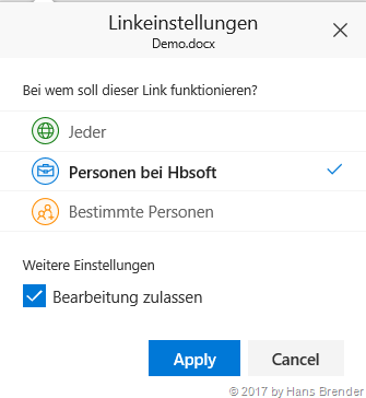 Link-Einstellungen in Office 365 wenn ich Benutzer der Firma auswähle (alle, dürfen diese die Datei auch bearbeiten, wenn ich den Haken gesetzt habe.