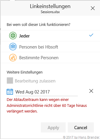 Link-Einstellungen in Office 365 Wenn ich die zeitliche Beschränkung (vorgegeben vom Administrator) überschreiten will, weist mich das System darauf hin, dass das nicht möglich ist.