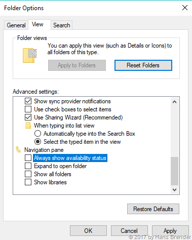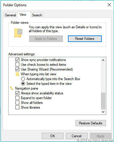 we switch now into the view, here to options, Change to Folder and Search Options, inside the Folder-options to View and here to scroll down to Navigation Pane….