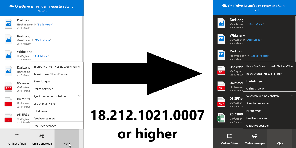 Eigentlich nichts besonderes mit dieser Version. Aber in Verbindung mit der Windows 10 Insider Version 18277 und dem neusten Next Generation Sync Client Version 18.212.1021.0007 schaltet der Client automatisch in den Dunkel Modus, wenn in Windows in den Einstellungen der Dunkel-Modus aktiviert wird.
