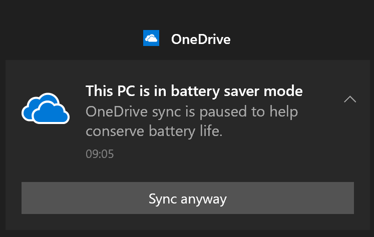 [HKCU\SOFTWARE\Policies\Microsoft\OneDrive]"DisablePauseOnBatterySaver"=dword:00000001