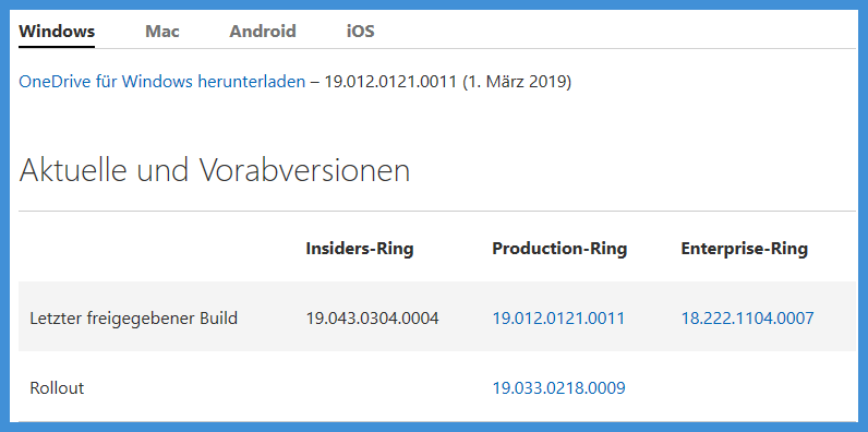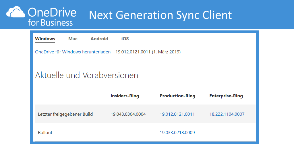 Alle 24 Stunden schaut der Next Generation Sync Client nach, ob es für den Ring (Insider, Produktion oder Enterprise) eine neue Version gibt. Damit dies überhaupt funktioniert, benötigt der Client Zugriff auf die Domänen oneclient.sfx.ms" and "g.live.com".