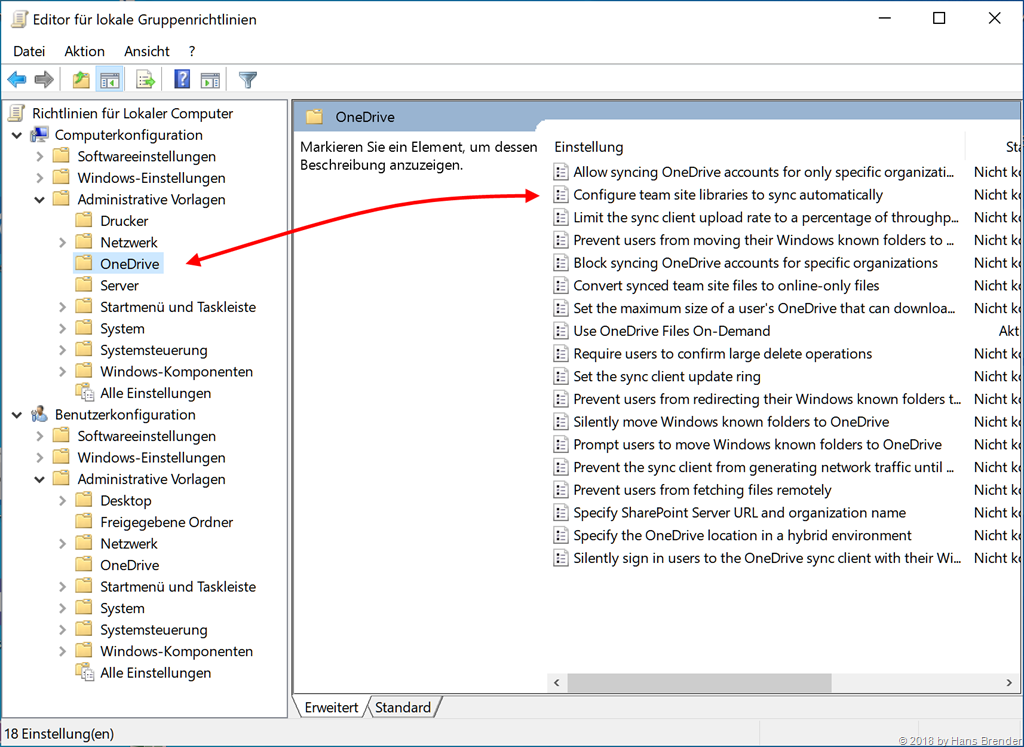 First, and that is important: If we are looking inside the OneDrive Group Policies, you will see, there is a Group Policy in both parts (Machine and User) with the same name