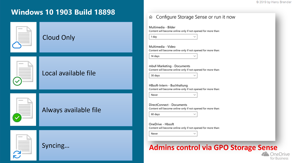 Speicheroptimierung ist zwar Bestandteil von Windows10 Version 1903. Während man aber über die Systemeinstellungen einzelne und unterschiedliche Dokument-Bibliotheken auch zeitlich unterschiedlich konfigurieren kann, fehlt das bei den Gruppenrichtlinien. Zum einen ist das nicht verwunderlich, den die meisten Benutzer werden sich nicht auf die Seiten für Speicheroptimierung verirren. Zum Zweiten hat jeder Benutzer auf unterschiedlichen Bereichen unterschiedliche Dokument-Bibliotheken im Zugriff. Dokument Bibliotheken , die synchronisiert wurden, müssen bei Gruppenrichtlinien also “global” betrachtet werden. Und nach Aussagen von Microsoft, werden sie das auch. Das bedeutet, dass Administratoren den Anwendern auch hier mit Informationen zur Seite stehen müssen.