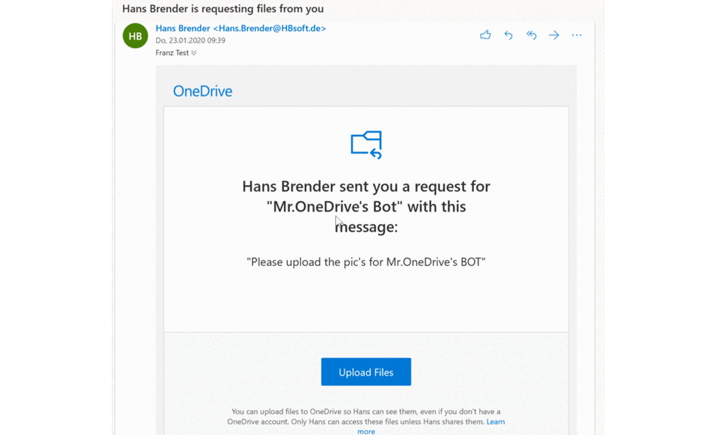 I can easily ask one or more people to send me files about an operation. Since the initiation happens from the web browser interface, I don’t even have to bother my email client. The recipient (s) will then receive an email and then have the option of uploading files. the recipient has no access to my OneDrive for Business. But I don’t have to look it up either because I get a message when the recipient has uploaded files.