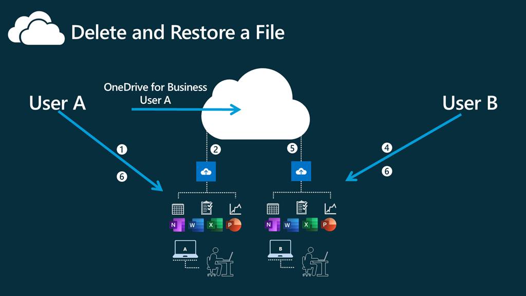 User B informs User A of the accidental deletion. User A switches to the browser of his OneDrive for Business, switches to the trash there and clicks on Restore. The file is moved to the original location, with basking meta data, including versioning. And then synchronized to the original devices of users A and B.