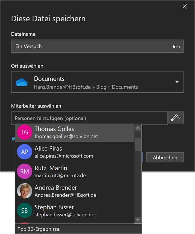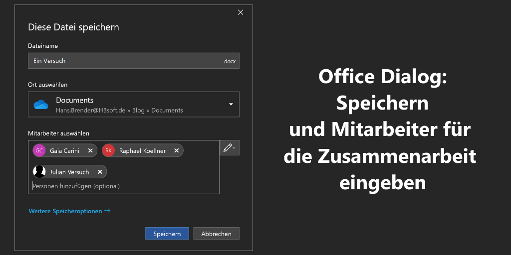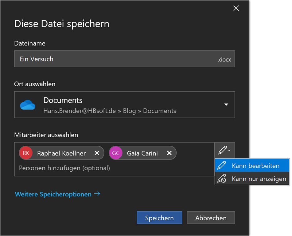 Natürlich kann ich auf weitere Speicheroptionen klicken und lande an altbekannter Stelle. Aber dann ist auch das Dialogfenster weg.