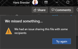 Ich weiss nicht, wie viele Client-Server Abfragen für die Rechte notwendig sind, aber das leidige Thema, mit externen Benutzern zu teilen, wird vermehrt auftreten. Nicht jeder Benutzer hat Kontakt mit seiner IT-Abteilung. Und wenn er es nicht weiss, dann wird eine Fehlermeldung schnell zum Boomerang, dann mache ich es in gewohnter Weise. Erst Speichern und dann Teilen.